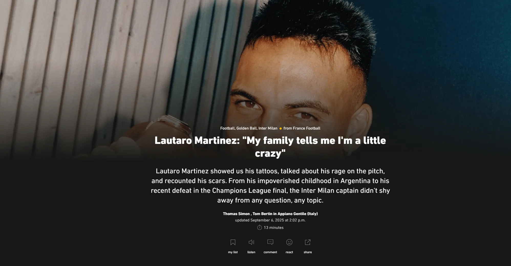 虎扑09月06日讯 法国足球周刊独家专访国米前锋劳塔罗-马丁内斯。