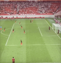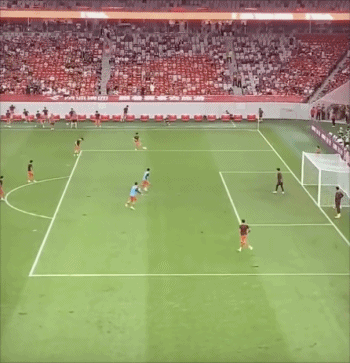 第六次:右路左脚传中,三人包抄,前一人左脚垫射,再次打上看台。